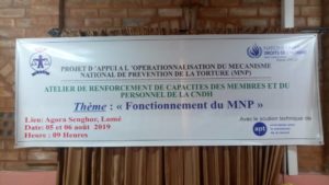 La Commission nationale des droits de l’homme (CNDH) a organisé les 05 et 06 août 2019 un atelier de formation de ses membres et de son personnel sur le fonctionnement du Mécanisme national de prévention de la torture. Cette rencontre qui a pour objectif de leur donner des rudiments nécessaires pour mieux prévenir la torture et autres peines ou traitements cruels, inhumains ou dégradants dans les lieux de privation de liberté, a été dirigée par le Président, Madame Nakpa POLO. Agora Senghor de Lomé a servi de cadre à cette rencontre.