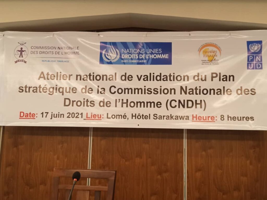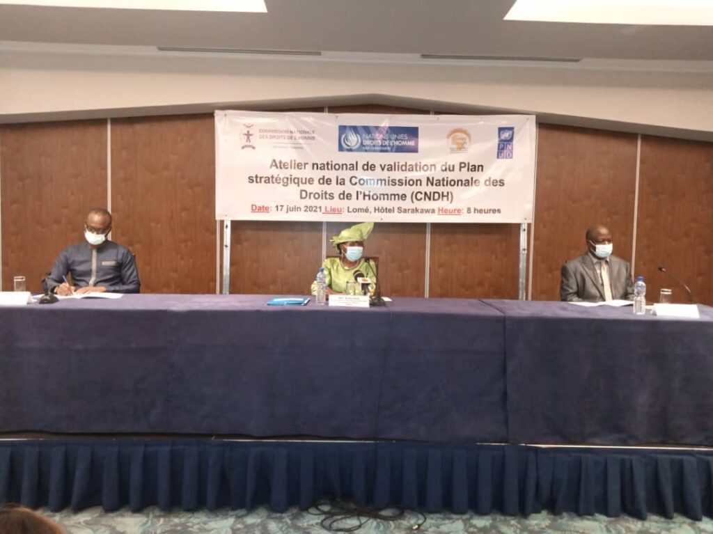 La commission nationale des droits de l’homme (CNDH) a organisé le jeudi 17 juin 2021 à l’hôtel SARAKAWA à Lomé, avec l’appui du Programme des Nations Unies pour le Développement (PNUD), un atelier national de validation de son plan stratégique 2021-2025. La rencontre a été présidée par le Président de la CNDH, Madame Nakpa POLO, en présence de M. DJERI EDJAWE, Directeur de cabinet, représentant le ministre des droits de l’homme, de la formation à la citoyenneté et des relations avec les institutions de la République et du représentant Résident Adjoint du PNUD, M. Mactar FALL.