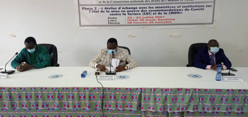 La Commission nationale des droits de l’homme (CNDH) a organisé les 22 et 23 juillet 2021, avec l’appui financier du Programme des Nations Unies pour le Développement (PNUD), un atelier d’échange et de plaidoyer sur la mise en œuvre des recommandations du Comité contre la torture (CAT) et celles par elle formulées lors de ses visites des lieux de privation de liberté. Cette rencontre a rassemblé les représentants des départements ministériels impliqués dans la mise en œuvre. C’est l’hôtel 30 août de Kpalimé qui a servi de cadre à cette rencontre. Les travaux ont été présidés par le Président de la Sous-commission Prévention de la torture, Monsieur Ohini Kwao Didi SANVEE, représentant Madame le Président de la CNDH.