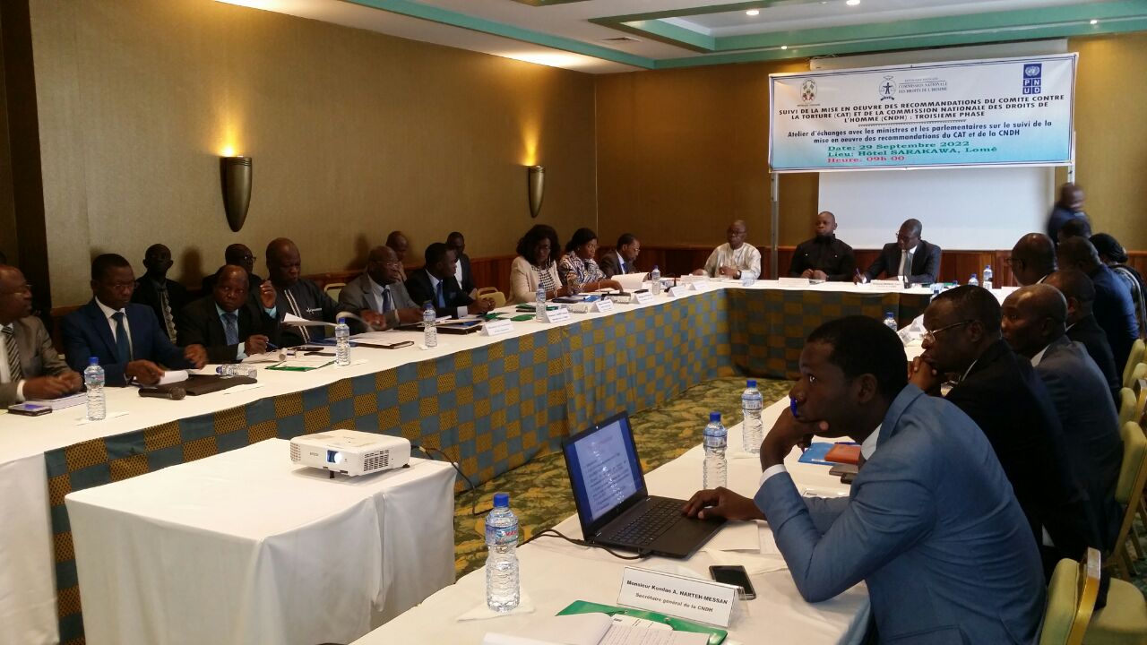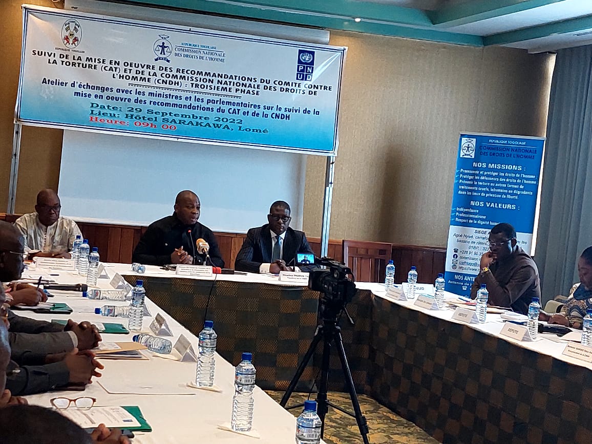 Dans le cadre du dialogue et de la concertation avec le gouvernement, la Commission nationale des droits de l’homme (CNDH), en collaboration avec le ministère des droits de l’homme, de la formation à la citoyenneté et des relations avec les institutions de la République, a organisé le 29 septembre 2022 à l’hôtel Sarakawa à Lomé, un atelier d’échanges avec certains membres du gouvernement, élargi aux membres de la Commission des droits de l’homme de l’Assemblée nationale. L’objectif visé est de solliciter la contribution et l’implication des ministres et autres autorités destinataires des recommandations du Comité contre la torture (CAT) et celles de la CNDH pour l’amélioration de la note du Togo lors de son prochain passage devant le Comité en 2023.