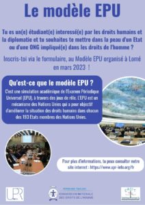 Tu es étudiant(e) d’une université publique ou privée de Lomé, intéressé(e) par les droits humains et la diplomatie, et tu souhaites te mettre dans la peau d’un État ou d’une ONG impliquée(e) dans les droits de l’Homme ? Inscris-toi à la simulation d’une session de l’Examen Périodique Universel (modèle EPU) organisée à Lomé.