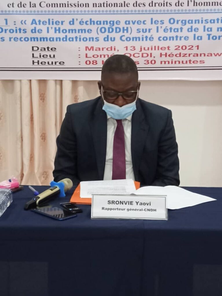 La Commission nationale des droits de l’homme (CNDH) a organisé le 13 juillet 2021, avec l’appui financier du Programme des Nations Unies pour le Développement (PNUD), un atelier d’échange avec les Organisations de défense des droits de l’homme (ODDH) sur la mise en œuvre des recommandations du Comité contre la torture (CAT). Cette rencontre qui a eu pour cadre l’Organisation de la charité pour un développement intégral (OCDI) à Hédzranawé, se situe dans le cadre de la mission de prévention de la torture confiée à la CNDH. Les travaux de cette rencontre ont été présidés par le Rapporteur général de la Commission, Monsieur Yaovi SRONVIE, représentant Madame le Président de la CNDH.